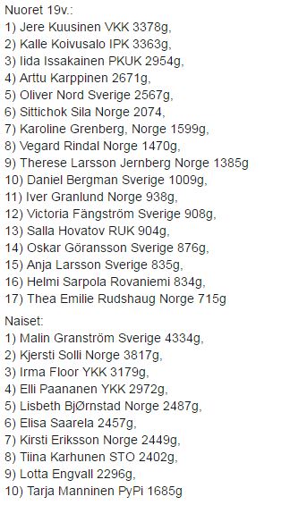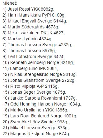 Jussi vant relativt suverent på 8082 gram. Hadde han samme snittet som meg, så hadde han isåfall 528 fisker. Tipper han hadde noe mere bonuser, og da litt færre i antall. Thomas og Martin som ble hos Jussi hele dagen hadde henholdsvis 3 og 7 bonuser på rundt 80-100 gram. Dem veide inn 4673 gram og 4232. Og Martin hadde mst av dem 2, men da 3,5 kilo bak Jussi.